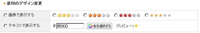 【ショップ作成】>【オプションの設定】>【ユーザー評価機能の設定】の「星印のデザイン変更」から表示の変更が行えます。