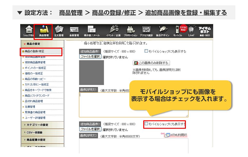 5. モバイルショップに表示したい追加商品画像1?3の[モバイルショップにも表示する]チェックをONにします。