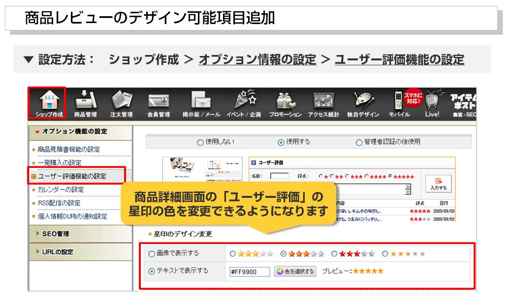 今まで、商品詳細画面のテンプレートによって「★」の色が赤と黒の2色しかありませんでしたが、より表情豊かな画像で表現できたりカラーコードで自由に色が変えられたりできるようになりました。