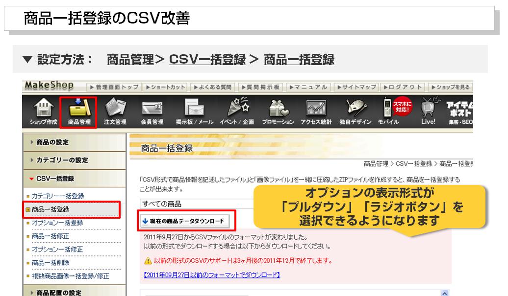 ※現在のCSVと2010年11月30日以前のCSVでもリリース後3ヶ月間は商品一括登録を行うことができます。それ以降は新仕様のCSVで、商品一括登録をご利用ください。