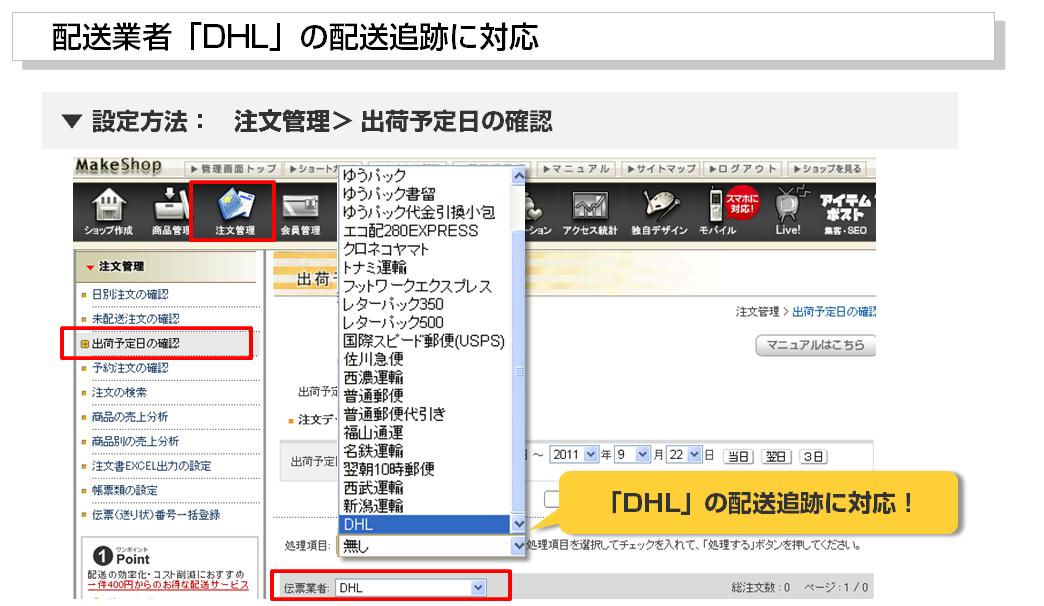 注文管理の「日別注文の確認」「出荷予定日の確認」の『伝票業者』プルダウンに上記配送会社を追加しています。